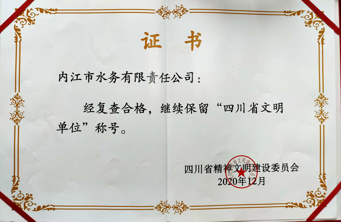 近年來,市水務(wù)公司黨委始終以*新時(shí)代中國特色社會(huì)主義思想為指導(dǎo),推進(jìn)精神文明建設(shè)工作不松勁,抓好生產(chǎn)經(jīng)營工作促發(fā)展,推動(dòng)公司精神文明和物質(zhì)文明建設(shè)的雙豐收。根據(jù)四川省精神文明建設(shè)委員會(huì)《關(guān)于復(fù)查確認(rèn)繼續(xù)保留稱號(hào)的四川省文明城市、文明村鎮(zhèn)、文明單位、文明家庭、文明校園的通報(bào)》(川文明委〔2020〕20號(hào)),內(nèi)江市水務(wù)有限責(zé)任公司順利通過復(fù)查,繼續(xù)保留“四川省文明單位”榮譽(yù)稱號(hào)。
