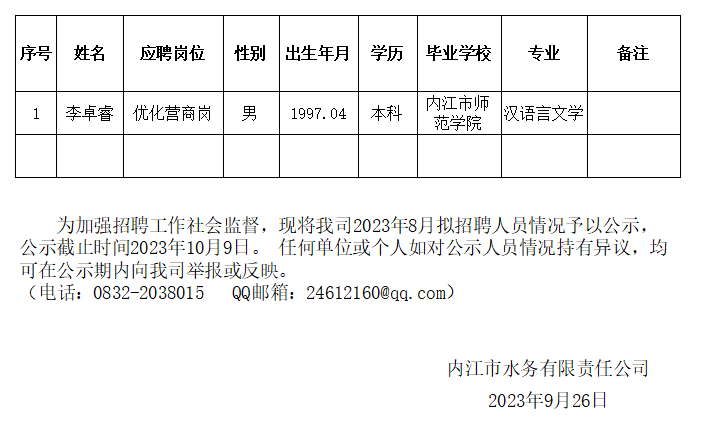 內江市水務有限責任公司2023年9月擬招聘人員公示