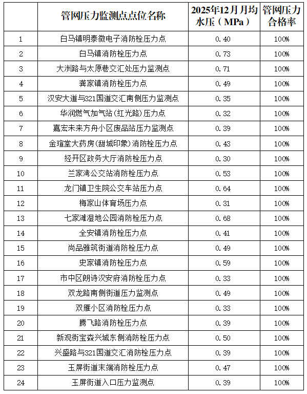 內江市水務有限責任公司2025年12月管網壓力月報
