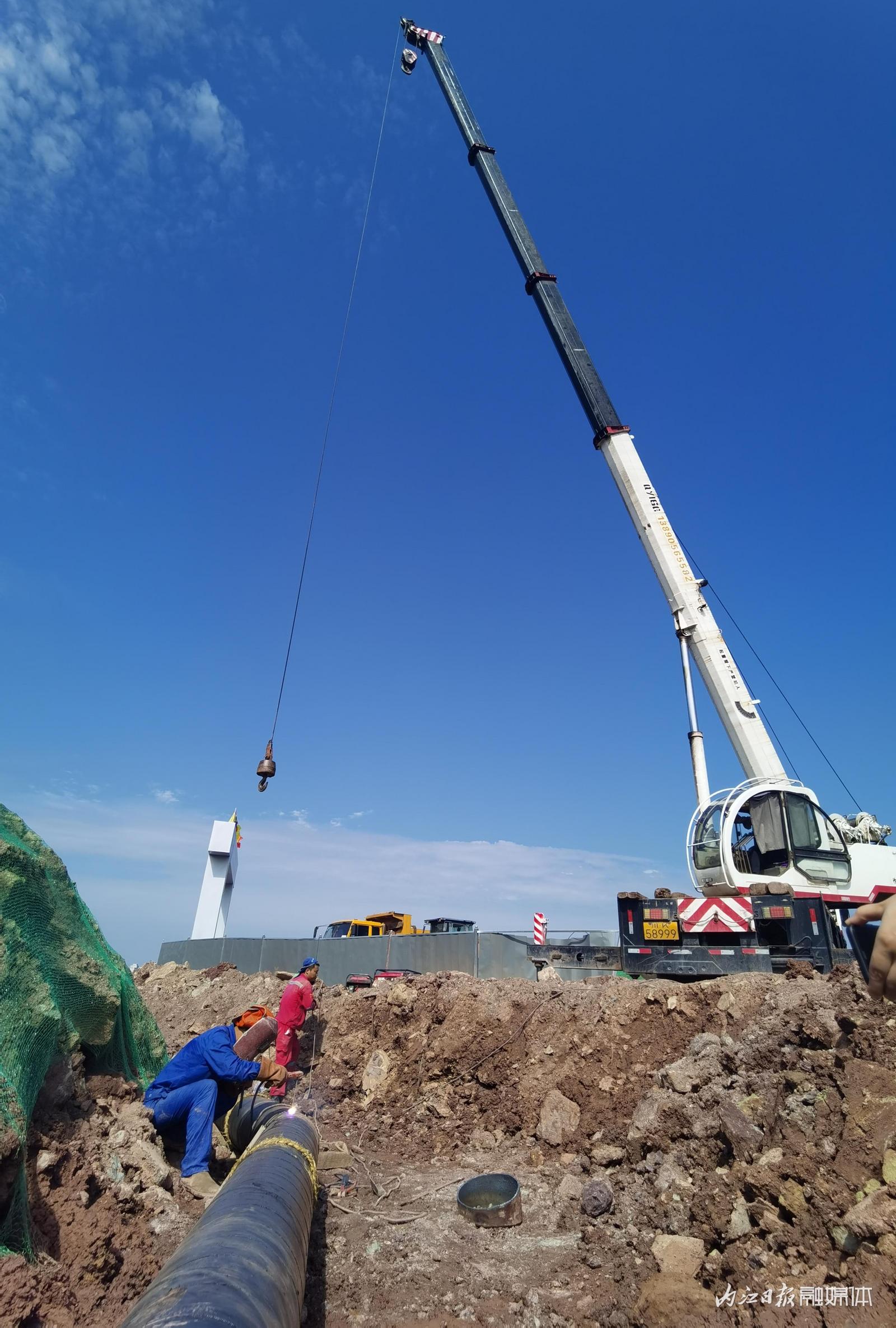 現場,機械聲轟鳴,大型挖掘機正在馬路邊開溝挖槽,大型吊車將管道吊到挖好的溝槽內,由施工人員逐節進行焊接……分工明確,專業有序,白晃晃的陽光下,工人們揮汗如雨,衣服早已濕透。