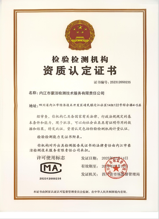 經(jīng)四川省市場監(jiān)督管理局批準,內(nèi)江市豪潔檢測技術服務有限責任公司正式取得《檢驗檢測機構資質認定證書》,此項資質的取得標志著我司在檢驗檢測方面已達到了國家相關標準和要求,具備了向社會提供公正、準確的檢測服務資質和能力。