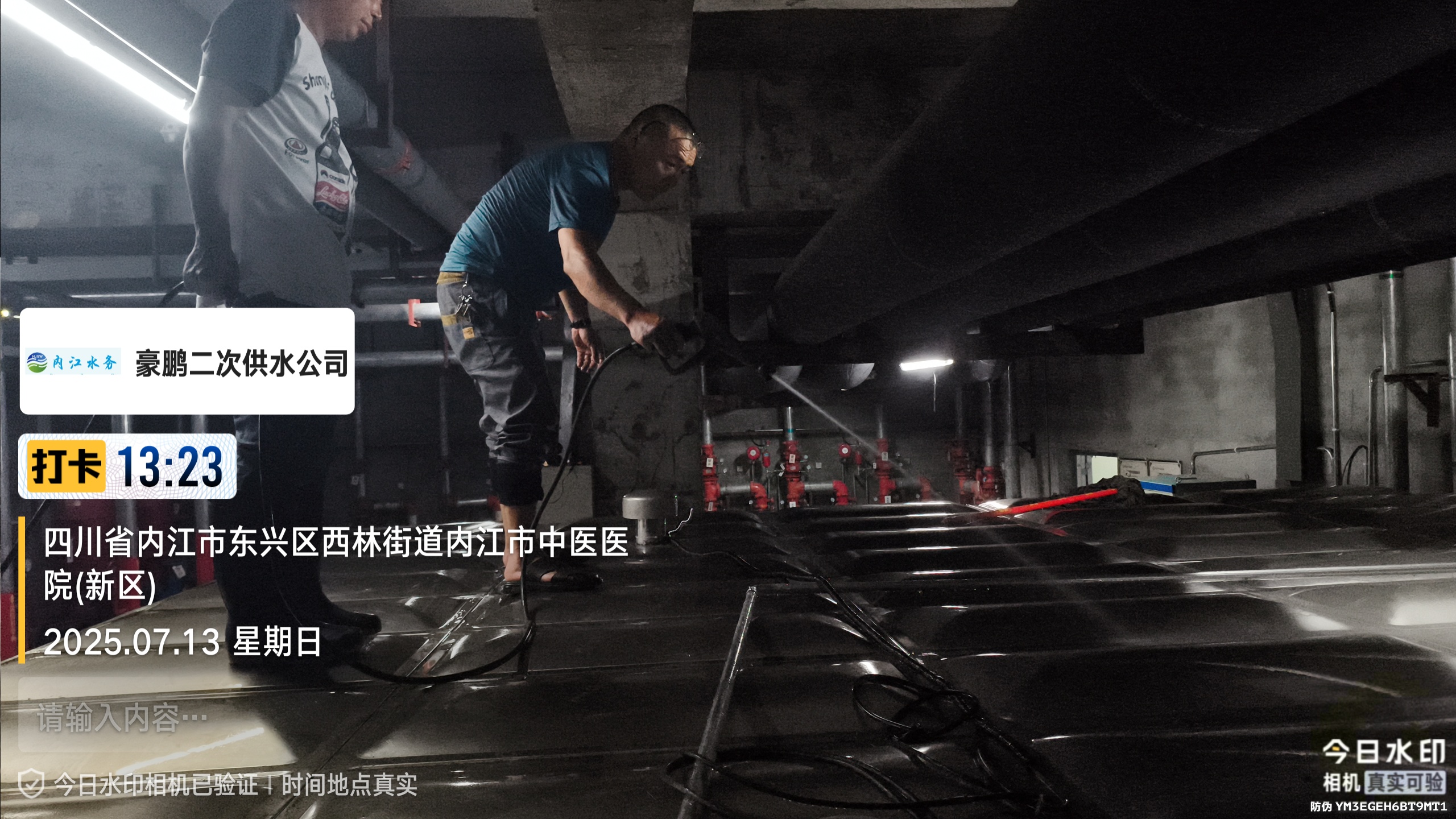 7月13日下午,豪鵬公司業務拓展團隊精確把握時機,利用內江市中醫醫院(新區)的非診療時段窗口,高效完成了該院二次供水水箱的清洗作業。